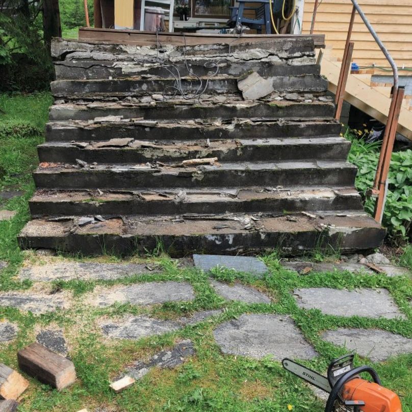 Asiakkaamme otti yhteyttä kaivatessaan mökilleen uusia portaita. Kohteessa oli vanhat, noin kolme metriä leveät betoniportaat, jotka olivat jo osittain sortuneet. Sovimme vanhojen portaiden purkamisesta ja uusien puuportaiden rakentamisesta. Suunnittelimme uudet portaat asiakkaan toiveiden mukaisesti ja sovimme aikataulusta. Uudet portaat valmistuivat ajallaan ja asiakas oli enemmän kuin tyytyväinen lopputulokseen.